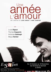 Une Année L’Amour, la formulation de la dualité artistique fragmentée des sentiments investis des codes du langage et un décrochage figé en noir et blanc ou en couleurs. Mode interactif exprimé selon la densité et la profondeur des échanges. Cette pièce, un partage d’idées, une écriture à quatre mains, une histoire déclinant le vécu avec les souvenirs. Le texte, un transfert en clair-obscur du désir d’aimer sur des images prises sur le vif.Salle Cabaret, l’intimité invite à écouter le silence sculpté sur les pierres composant l’architecture des lieux, héritage historique. Le décor, la sobriété telle une virgule qui sépare le passé du présent, le romantisme et la passion, le visible et l’invisible. Le mobilier se compose d’une petite table, une chaise, un banc, une lampe de bureau, une chaine stéréo.Une jeune femme s’assoit et commence l’écriture d’une lettre avec ces mots "Mon amour". Sur son visage, se lisent l’intention et la sincérité des propos allongés sur le papier. D’amour, il ne reste que des braises, l’homme qu’elle a aimé, est parti. A travers ces écrits, les souvenirs calligraphient un amour consommé de pleins et de déliés. En transparence, un jeune couple se détache de l’atmosphère feutrée