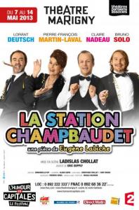 Pour sa 7e édition, le festival L’Humour en Capitales (du 7 au 17 mai) souhaite mettre à l’honneur le théâtre en mettant en scène spécialement pour l’occasion une comédie de Labiche, La Station Champbaudet avec Pef, Bruno Solo, Lorànt Deutsch et Claire Nadeau. Mme Champbaudet (Claire Nadeau), veuve mûre, encore débordante d’affection, se croit aimée d’un jeune architecte (Lorànt Deutsch) qui fréquente assidûment son appartement. C’est en réalité la voisine qui attire le Don Juan... Déjoué par le mari jaloux, ses affaires ne vont pas tarder à se gâter très sérieusement...Ladislas Chollat signe une mise en scène drôle et des plus rythmées. Les subtils changements de décors sont ponctués de chansons que toute la troupe interprète avec fraîcheur et vitalité, au rythme du piano qui accompagne les actions dramatiques.On salue le jeu impeccable de Lorànt Deutsch, l’exceptionnelle présence scénique de Bruno Solo, le côté Robins des Bois de Pef et le parfait naturel comique de Claire Nadeau. Un moment de pur bonheur, un brin de folie à découvrir au Théâtre Marigny.