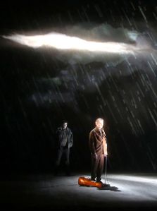 Trois bonnes raisons d’aller découvrir cette création théâtrale d’Emmanuel. 1° Parce que les deux romans de Sorj Chalandon (Mon Traître et Retour à Killybegs) dont est tiré le spectacle sont extrêmement intéressants. Le fond historique est passionnant en soi : la guerre civile en Irlande. Le héros de ces deux opus, Tyrone Meehan, inspiré du leader de l’IRA, Denis Donaldson, est un personnage fascinant, dont la trahison (car le "traître", c’est lui, on le sait dès le début), avouée en 2005, fut un choc pour tout le monde et surtout pour Sorj Chalandon, son ami de longue date. Mais le plus intéressant est encore la réflexion menée par l’écrivain sur la trahison. Son premier roman met en scène Antoine, son double fictif, face à ses interrogations d’homme trahi : si un ami a trahi sa cause politique a-t-il pour autant trahi tout le reste, tous ceux qui ont partagé sa vie ? S’il a menti sur un point, était-il sincère par ailleurs, et notamment dans ses relations amicales ? Voilà les questionnements (universels) de Sorj Chalandon qui, dans le second opus, offre un formidable contrepoint sur le traître. Cette fois c’est Tyrone qui raconte sa vie et confie sa trahison. Cette vie, réinventée par l’auteur, est émouvante, complexe, propre à expliquer la trahison. Pour le lecteur ou le spectateur, l’œuvre prend tout son sens grâce à cette structure en diptyque. C’est le changement de point de vue sur le traître qui en est le véritable ressort dramatique. Peut-on excuser la trahison quand on en connaît les raisons ? A chacun de se faire son idée.2° Parce que l’adaptation d’Emmanuel Meirieu a su conserver le sens du texte. En l’élaguant, il en a fait ressortir l’essence, sans le "trahir". Choisir de le couper plutôt que de le réécrire a permis de conserver son style. Récité dans un décor apocalyptique, sous une pluie (fictive) torrentielle, devant un ciel noir parsemé d’éclairs et ponctué de coups de tonnerre qui retentissent dans la pénombre persistante, il garde sa saveur. Elle en est même transcendée. L’atmosphère glauque créée par la scénographie superbe et monotone convient parfaitement à l’histoire et au ton des récits. Quant au dispositif qui permet que les comédiens soient encadrés par cette pluie incessante, c’est une vraie réussite visuelle. Beau et triste, voilà donc le tableau de deuil que propose Emmanuel Meirieu.3° Parce que les deux monologues, trois pour être plus exacts, traduisent bien les deux (voire trois) points de vue sur la trahison, rendant l’essentiel des deux romans et de leurs deux voix. Les comédiens qui s’y collent sont admirables. Pas une défaillance de mémoire, pas une hésitation ; une performance en soi pour des monologues qui durent une demi-heure chacun. Jérôme Derre dans le rôle d’Antoine et Jean-Marc Avocat (habitué des exploits mémoriels) dans celui de Tyrone sont extrêmement convaincants. Leurs voix sont à la fois graves, profondes et douces pour dire l’incompréhension, la peine, les épreuves endurées... Entre leurs deux longs soliloques, apparaît Stéphane Balmino, qui incarne Jack Meehan, le fils de Tyrone, lui aussi trahi. Son chant, tel une virgule, s’élève comme une prière, ponctuant habilement et poétiquement la pièce. Et l’on ne parle pas de cette quatrième voix (off), qui nous offre un conte en guise de parabole, jolie manière d’expliquer la vie de Tyrone... L’ensemble donne une harmonieuse polyphonie.