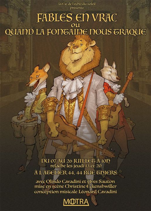 Jean de La Fontaine, grâce à nos deux comédiens je redécouvre, et j'apprends que la fourmi, c'est Colbert, Le lion c'est Louis XIV et la cigale Fouquet. J'apprends que chaque animal représente un gentilhomme ou un ministre ou une personnalité. Ok vous allez me dire, ben oui c'est évident. Ben pas pour moi. Pouvoir mettre un nom sur chaque animal..............Le spectacle est enlevé, dynamique, recherché. instructif. Tient est-ce que vous savez qui est Phèdre ? ah ah, vous allez me crier Racine. Et bien non, Moi je vous parle de Phèdre le philosophe né en 138 avant JC. Et bien ce Phèdre a inspiré La Fontaine, comme Ésope. Un chouette spectacle bien écrit.