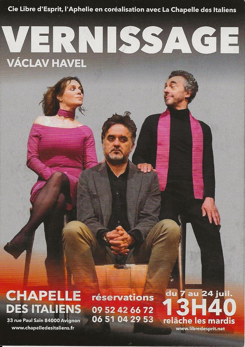 J'adore Vaclav Havel, en tant qu'auteur, l'homme politique je ne sais pas. Déjà voilà plusieurs années j'avais vu Audience. Et là la chance de pouvoir applaudir les deux autres. Là, Vernissage. Un couple vient de finir de décorer leur appartement, et il fait un vernissage, invite le seul ami qu'il a, Seulement si c'est le meilleur ami, il n'a pas tout à fait le même mode de vie. Et ce couple va expliquer à ce pauvre Ferdinand combien leur vie est idyllique, et la sienne médiocre. Mon Dieu quelle horreur 'ces amis". A fuir, mais Ferdinand est poli, il reste..J'ai ri, tant les propos de ce couple sont grotesques, conformistes. J'ai beaucoup aimé, Ils jouent jusqu'au 24 juillet alors il faut vous dépêchez, venez.