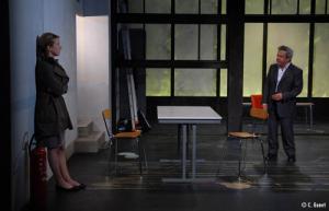 Une pièce quasiment déserte. Un homme, une femme. Elle, Una, jeune, belle et fragile, est venue le retrouver lui, Ray, quinquagénaire, fatigué, plutôt insignifiant au premier abord. Leur lien : ils ont été amants quinze ans plus tôt. Elle avait douze ans, lui quarante. Cette histoire passée rappelle inévitablement Lolita de Nabokov, à ceci près qu’en envisageant la rencontre quinze ans plus tard, alors que les deux protagonistes sont adultes, David Harrower évite de heurter directement la vue et l’entendement du spectateur. Pourtant la question de la pédophilie est bien là. Toute l’entrevue d’Una et Ray est centrée sur leur liaison amoureuse passée et sur ses répercussions dans leurs vies respectives. Comment un homme se remet-il d’un procès pour détournement de mineure et pédophilie ? Comment une jeune fille construit-elle sa vie de femme après avoir vécu une telle aventure ? La confrontation, timide au début, amène petit à petit toutes ces interrogations. A mesure que les personnages se livrent, la tension s’accroît et les réponses affleurent. Le dialogue est finalement cathartique : chacun arrive à avouer à l’autre ce qu’il a ressenti au moment de l’histoire en question et par la suite. Et les réponses ne sont pas forcément celles que l’on aurait attendues. Ray n’est pas vraiment un Humbert Humbert et Una une Lolita. Ce ne sont pas vraiment non plus un Roméo et une Juliette. Leur histoire est plus complexe qu’il n’y paraît a priori. Traumatisés tous les deux, ces héros obtiennent incontestablement notre empathie. N’est-ce pas la société qui a perverti une histoire d’amour innocente et sincère ? Cette société "bien pensante" n’a-t-elle pas fait plus de mal à la jeune Una que sa liaison avec un homme qu’elle aimait et qui l’aimait ?Léa Drucker et Maurice Bénichou, subtilement, nous laissent bien percevoir tout cela. Leur interprétation des deux personnages, toute en nuances et en délicatesse, fait la part belle à l’émotion sincère : c’est une blessure d’amour que leurs personnages ont vécue et revivent en se retrouvant, pas une sombre histoire de pédophilie et de souillure. Léa Drucker nous émeut par sa fragilité et Maurice Bénichou par sa vulnérabilité. Chacun à sa manière gagne la sympathie du spectateur, qui ne peut condamner complètement la liaison passée, pourtant choquante en théorie. C’est le pari de l’auteur et de la metteuse en scène : faire oublier la question du délit pour laisser place à l’histoire d’amour. Dans une mise en scène très sobre, avec une scénographie elle aussi minimaliste, Claudia Stavisky met en relief le texte et l’émotion de la rencontre. Aucun effet superflu, lumière sur les êtres et leurs sentiments, dialogue avançant à tâtons, par petites touches, bribes lâchées au fil de la conversation, réminiscences d’un passé vivace, voilà à quoi peut se résumer Blackbird. Ce huis-clos, dont la tension psychologique est la véritable intrigue, vaut donc essentiellement pour la confrontation des individus, d’autant que les comédiens qui les incarnent sont justes.