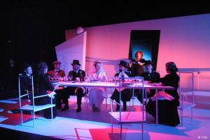 La Noce, qui a été renommée La Noce chez les petits bourgeois est l’une des premières pièces de Brecht : un couple de jeunes mariés donne son repas de noces dans sa nouvelle maison, dont les meubles ont été entièrement conçus et fabriqués par le marié. La famille et les amis proches sont présents ; le dîner, qui commence tranquillement, malgré les blagues et les anecdotes inintéressantes du père de la mariée, dérive tout doucement vers un règlement de comptes général. A l’image des meubles qui s’écroulent un par un, les convives "tombent" tour à tour, victimes du fiel des autres. Pas un n’en réchappe, pas même la mariée, qui serait déjà grosse, d’après une "amie".Le thème de la pièce parle donc à tout le monde : qui n’a pas assisté à un repas qui tourne mal ? Qui ne connaît pas de problèmes familiaux, liés aux non-dits et aux vieilles rancurs ? Ou, du moins, qui n’a pas rêvé de déballer son sac en famille pour soulager sa conscience ? Brecht ne fait que mettre en scène, de manière certes exagérée, les conflits entre proches que tout un chacun a pu expérimenter. Le seul reproche que l’on puisse adresser à son texte est de démarrer un peu lentement. Le vrai règlement de comptes n’a lieu que dans le dernier tiers de la représentation ; c’est dommage car c’est le plus piquant et le plus savoureux de la pièce.Patrick Pineau, pour dynamiser le début, nous livre une excellente entrée en matières : musique et stroboscopes qui donnent l’impression d’assister à une séance diapo. On est alors conquis. La baisse de rythme qui suit, liée au manque de sel du début du texte, nous déçoit quelque peu. Cependant, grâce à la montée en puissance des mots et de la mise en scène, qui suit l’évolution de la dispute, nous sommes de nouveau sous le charme du spectacle.Le décor est bien pensé : un ensemble en carton blanc, qui se désagrège au fur et à mesure de la soirée, en même temps que les relations entre les gens. Tout se démonte : la table, les chaises, l’armoire... Sur ce fond blanc, les convives sont en noir... et blanc pour la mariée (tout de même !). Seules les lumières font varier l’atmosphère : rose, bleu... Le tout en musique et en chansons car deux des invités entonnent quelques couplets, s’accompagnant d’une guitare sèche. L’ambiance est bel et bien festive, ce qui ne l’empêche pas d’être aussi sanglante. Et tout se termine sur un effet visuel bluffant. La mise en scène nous fait ainsi oublier la mollesse du début du dialogue. On repart de cette Noce ravis d’avoir assisté à un massacre en règle.