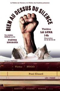 Les corps entremêlés allongés à même le sol découvrent une inertie en suspension palpable avec la tension dégagée par la musique. Dans un élan collectif, les corps se détachent l'un de l’autre, se lèvent et prennent possession de l’espace ouvert. Les mouvements s’accordent dans une litanie articulée. Les bras dessinent des esquisses usinées. La création de l’improbable est en route, les mots ne sont plus très loin.Le texte dénonce les servitudes imposées aux enfants dans des pays où les droits de l’enfance sont ignorés et bafoués. Le législateur enrichit les riches et appauvrit les pauvres. On peut détruire la misère sans se voiler la face contre terre.Dans les métropoles, des familles vivent dans des conditions indignes. Dans la rue, des gens meurent de faim et de froid. L’indifférence conduit au carré de l’indigence. Le peuple souffre et désespère. L’usure dévore les vieux qui ont travaillé toute leur vie pour percevoir une retraite de survie.Bien au-dessus du silence pose la réflexion sur la relation du poète face aux enjeux locaux et internationaux, lesquels dévastent nos préceptes sociétaux. Le poète s’engage en résistance dans sa façon d’écrire et d’appréhender sa vision des choses. Il écrit son histoire sur des pages blanches pour être lu sur les murs sombres de l’Histoire des hommes. La quintessence des mots n’a pas lieu d’être visible quand la misère s’écrit avec la boue et le sang. L’esthétique se farde de crasse quand les arpenteurs de l’ombre fuient les étoiles de peur d’être repérés.Résistance et écriture s’accrochent l’un à l’autre, une faconde à la révolte. Le poète, sans rime et sans revers, liste blanc sur noir l’idéal humain sur un contrat social. Le pacte des mots dans un monde de fous.Dans le spectacle, les comédiens sont munis du mot juste, ipso facto, pour répondre aux démunis de tout horizon. Le texte isole les monologues, les dialogues ont cours avec force et rigueur. Entre complicité et affrontement, les cinq protagonistes se fondent intégralement dans cette dramaturgie. Ils manifestent une vivacité et une énergie sans retenue. Process indissociable du contexte évoqué.La scénographie s’articule autour du montage et du démontage des cubes constituant les éléments du décor, la lumière orchestre sa densité et sa fluidité selon l’intensité des situations, la musique lance ses blanches et ses noires libérées d’une partition en cours de composition.La mise en scène est profonde, intense et révèle un emphysème obstruant les voies respiratoires de l’homme condamné à survivre dans une geôle sociale sciemment construite par d’autres hommes et au poète engagé dans une lutte contre l’abnégation.Ce spectacle qui sera joué au Off en Avignon du 8 au 31 juillet au Théâtre La Luna est résolument actuel, réaliste. Une pièce où le mot "liberté" a pour synonyme "poésie".