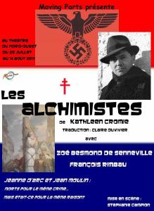 Les Alchimistes de Kathleen Cromie fait bien partie de ces uvres écrites par un auteur étranger et promu par une association, Mooving part, créée par Stéphanie Campion et dont le but est de donner un avant-goût d’une uvre étrangère et de la promouvoir en vue d’être éditée ou jouée sur la scène française.Le choix du théâtre du Nord-Ouest pour la jouer est de bon ton pour lancer une telle pièce sachant que frotter son talent à une humble scène sans subventions pour évaluer le succès futur et le contentement du public est une démarche prudente et constructive.La prudence est de mise en effet car la thématique la rencontre anachronique de deux héros de l’histoire de France dans le désarroi d’une captivité est un défi de taille.Il y a sensitivement quelque-chose de cet art culinaire anglo-saxon qui ose mêler des saveurs sucrées et salées dans la réunion de ces deux icônes que sont Jeanne d’Arc la sainte et martyre catholique et Jean Moulin le héros de la Résistance française.Ce qui relie ces deux personnalités se résume ainsi par Kathleen Cromie : "Voir une grande âme se perdre, que ce soit dans la mort ou dans la damnation est un supplice qu’ils n’endureront pas sans lutter".Le jeu des comédiens fait frémir d’émotion : que ce soit un François Rimbau (Jean Moulin) souffrant et vociférant une soif de justice mélangée à la douleur de ses tourments, qu’une Zoé Besmon de Senneville (Jeanne d’Arc) toute frêle de sa jeune candeur, transportée malgré elle dans ses attitudes comme dans sa pensée par le mystère de la grâce.Cette rencontre inattendue requiert incontestablement une pluie d’applaudissements rien que pour saluer le jeu des comédiens s’appliquant à un texte pas évident autant que pour saluer l’arrivée jusqu’à nous d’un texte d’Outre-Manche qui sort heureusement de l’ombre comme beaucoup d’autres méconnus le devraient aussi.
