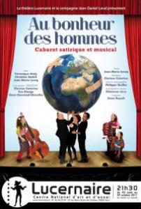 La salle rouge du Lucernaire se devine sous une éparse fumée blanche justement provoquée à l'entrée des spectateurs. L'ouvreuse, guillerette et mignonnette, donne le la en prélude au spectacle. La musique de rue s'invite sur la scène en la présence de trois musiciennes. Ambiance tzigane entre les robes chamarrées dessinant des esquisses musicales sous les airs déployés de l'accordéon, de l'archet glissant sur le corps boisé de la contrebasse et des doigts pinçant avec fierté les cordes du violon. Chansons interprétées dans une langue plus proche de la manche que du conservatoire. Les mots s'enchainent avec virtuosité et les anicroches linguistiques prêtent à rire.Clin d'il perçant aux contrôles d'identité à l'arrivée des comédiens caricaturant avec dérision et suspicion les agents de l'état affectés à cette mission. Au sérieux du sujet, la gouaille prend rapidement le pas et va progressivement s'installer au cur des causes qui émaillent le quotidien.Jean-Marie Lecoq et Clarisse Catarino déclinent avec consternation l'abécédaire des thématiques brûlantes de la planète. Un éditorial des faits divers de l'actualité d'aujourd'hui chantés par des gorges citoyennes. Quelques grands slogans de la précédente campagne élyséenne sont entonnés comme pour réveiller des souvenirs douloureux et embourbés dans la mémoire collective. "Travailler plus, pour gagner plus" , cinq mots qui s'enfilent comme des poupées gigognes, la réalité un rêve construit sur un nid de cigognes.Véronique Ataly, Christian Gaitch et Jean-Marie Lecoq s'en donnent à cur joie sans pierre fendre en déclamant la malbouffe, le libre échange, les religions ou encore l'écologie. De l'énergie, les protagonistes en ont à revendiquer car ce spectacle cabaret est excessivement très bové et monté avec un certain qu'hulot.La satire accompagne avec finesse la provocation librement voulue et textuellement exprimée à la façon des chansonniers d'hier. Musique et paroles vont en crescendo selon le sujet encensé. La Terre est ainsi plus belle à regarder avec ses fantaisies absurdes. Elle prend la pose pour quelques rimes de poésie acerbe. Les mots s'évanouissent sur une toile grandeur nature où le burlesque s'étale sur une palette d'essences mêlées.La scènographie, un container à poubelle, lequel ouvert, ressemble au sac de voyage de Mary Poppins. Des trésors d'instruments et autres colifichets révélés à chaque chanson. Sans oublier les guirlandes sans fin de bouteilles en plastique, l'astuce réside dans l'économiquement durable et dérangeant.Au bonheur des hommes, une mise en scène ciselée autour de vocalises fortes et spontanées, lesquelles s'harmonisent sur des airs de swing, de jazz manouche et de tango. Le texte de ce cabaret satirique, une musique participative ponctuée des relations étroites établies entre les comédiens, les musiciens et le public. Un zest d'écoute pour un geste d'attention.