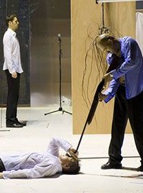 C'est au monde de la finance que Bruno Meyssat s'attaque dans 15%. Il évoque explicitement la crise des Subprimes aux Etats-Unis, qui entraîna la chute de la banque Lehman Brothers, la dévalorisation de milliers de biens immobiliers, la ruine de nombreuses familles, puis le vacillement du système financier. Mais plutôt que de bâtir une fiction narrative, le metteur en scène lyonnais, accompagné de sa troupe, Théâtres du Shaman, préfère évoquer l’univers impitoyable des traders à coup de métaphores visuelles : Des hommes en costume/cravate réduits à se comporter en animaux, mangeant à quatre pattes des feuilles de papier lacérées. Une tente évoquant la déchéance certaine de celui qui sort ruiné du système. Des tondeuses qui broient tout sur leur passage. Des casques de football américain pour tout le monde lorsqu’il s’agit de survivre dans ce milieu hostile.Tout cela prend place sur une immense scène où s’amoncellent des objets hétéroclites : écrans d’ordinateurs, figurine d’Homer Simpson (symbole des USA bien sûr), miroir suspendu, lambeaux de vêtements... L’ensemble peut paraître désordonné au début, mais chaque objet trouve, à un moment ou à un autre, sa place dans la démonstration.C’est essentiellement la violence de notre système capitaliste, où tout est fondé sur la finance, qui ressort de la pièce. Les sept comédiens, six hommes et une femme, incarnant vraisemblablement des financiers, ressemblent à des pantins lancés dans la jungle. Tous leurs mouvements, toutes leurs confrontations sont à la fois mécaniques et heurtés. Il en ressort une véritable inhumanité. Le fond sonore, brutal lui aussi, et l’atmosphère lumineuse agressive, blanche et crue, accentue cette impression d’être face à un monde déshumanisé, dont les protagonistes n’ont ni individualité ni états d’âme. L’enchaînement de nombreuses scènes métaphoriques nous fait ainsi bien comprendre le propos, mais nous laisse malheureusement froids. L’expérimentation théâtrale est intéressante, cependant elle ne peut susciter l’empathie et par là même l’émotion. Voilà donc un spectacle très réussi visuellement, très cérébral, dont on se "distancie"... trop.
