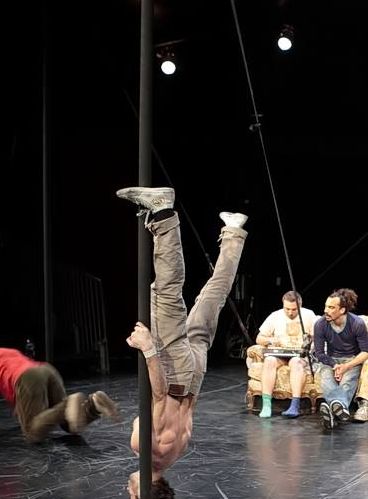 Les autres le rejoignent, ils s’échauffent sur le plateau et bien vite se dénudent, torse nu devant une foule d’yeux rivée sur leurs muscles saillants. On dit qu’on va jouer à un jeu : vous vous bandez les yeux et le premier qui a monté deux mâts chinois et qui s’est perché en premier a gagné. Le dernier, perdu. Ainsi donc, c’est cela, un jeu. Des prétextes, des contraintes afin de redécouvrir le plateau, le corps, la notion de groupe et surtout comment je travaille avec le mât. C’est simple et génial comme concept. C’est comme si nous assistions au travail de préparation pour la création d’un prochain spectacle, à la différence que c’est le spectacle !