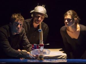 La Pelle du large, un nouvel exil made by Philippe Genty & Compagnons. Hernan Bonet, Antoine Malfettes, Yoanelle Stratman à la barre de cette traversée des océans semée de rencontres mythologiques, de vents à contre-courant, d'amarres larguées sur des îles bercées par les illusions et leur inverse existentiels. Un spectacle construit avec des p'tits riens qui s'accordent à la matérialité du quotidien, un tire-bouchon, une passoire, un éventail, une pelle, un balai au manche cassé, une bassine. A ces ustensiles anodins, se greffent des objets fabriqués de toute pièce, un arbre à ciseaux à bout rond, des papillotes qui invitent à découvrir des personnages en pâte à modeler... Ces choses évoluent le spectacle durant sur une table recouverte d'une toile bleue, bleue comme les mers du sud, bleue comme les océans, bleue comme les horizons indéfinis.