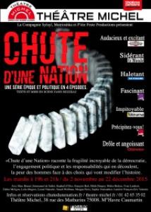 Le théâtre, parfois, affecte les pièces marathon : il invite le spectateur à revoir en profondeur sa notion du temps et de l'espace en proposant des pièces d'une durée de six, sept, huit voire neuf heures. Chute d'une nation s'inscrit à la fois dans cette ancienne tradition de pièces qui défient le temps habituel d'une pièce de théâtre avec 7h30 de représentation mais aussi dans celle, nouvelle, qui fait fureur depuis plusieurs années sur nos petits écran: les séries. En effet, ce qui marche à la télévision, pourquoi cela ne marcherait-il pas dans une salle de spectacle ? D'ailleurs, le sujet traité dans Chute d'une nation la politique en est un que les téléspectateurs affectent tout particulièrement... On y assiste notamment à l'ascension d'un homme politique qui devra remettre en cause certains de ses principes pour jouer un premier rôle dans une partie de chasse au pouvoir à laquelle initialement il n'avait pas prévu de participer.