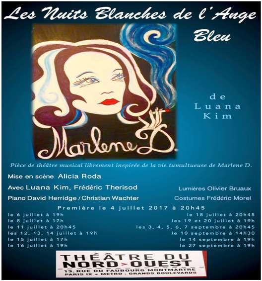 Frédéric Thérisod l’incarne en appuyant sur le côté américain, presque texan, de l’artiste, lui, qui, au départ, singeait les aristocrates. Ici le cigare remplace le monocle. Dans son ombre, se glise le compositeur Friedrich Höllander, spécialiste des musiques de film. C’est David Herridge qui l’incarne. Et avec brio, s’installant au clavier. Sous nos yeux, Marlène prend son envol. Belle performance de Luana Kim dont la voix est juste, touchante. Lili Marleen – le standard que l’on attendait tous – est ici interprétée en américain. Je regrette personnellement qu’elle ne le fût pas dans les trois langues, ce que faisait Marlène Dietrich dont le tour de force avait été de confisquer une chanson nazie, de se l’approprier et de la faire reprendre en chœur par les troupes yankee.