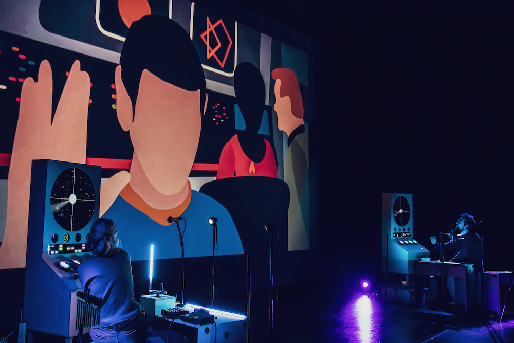 Pour nous les donner à voir, à entendre, à ressentir, Elie Blanchard et Victoria Follonier fabriquent en direct un spectacle à la croisée du documentaire, du cinéma d’animation et des nouvelles technologies. Conteurs, techniciens, dessinateurs, informaticiens et musiciens, les créateurs de Quitter son caillou ont plusieurs cordes à leur arc et de l’inventivité à revendre. Le dispositif qu’ils mettent en place sur scène est très intrigant puisqu’il permet à la fois de faire défiler des images fixes et de les animer en direct, mais aussi de diffuser les voix-off des protagonistes tout en sonorisant leurs histoires, avec des bruitages et de la musique. A deux seulement, ils recréent ainsi tout un univers, ou plutôt cinq univers différents.