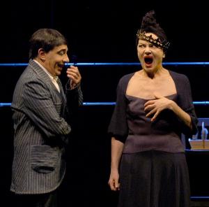 Le Palais de la reine ne parle pas vraiment d’une reine, pas plus que d’un palais d’ailleurs, ou du moins pas d’une reine et d’un palais au sens que l’on pourrait entendre à première lecture du titre. Cette comédie à l’humour très noir nous présente, en fait, une mère étouffante, couronnée par son unique fils, sur qui elle exerce sa tyrannie. Couronnée ? Oui, parce qu’elle a trouvé la fève dans la galette !... Mais, ce cactus, que faisait-il enfoui dans une galette des rois ?... La reine a maintenant une épine dans le palais !!... Est-ce pour cela que sa langue devient piquante comme celle d’une vipère ? Elle ne peut plus s’empêcher de débiter toutes les méchancetés qui lui passent par l’esprit au sujet de sa belle-fille, Raymonde ! L’intruse, qui s’est immiscée dans le couple mère-fils, a bien mérité de finir décapitée par un scooter des mers ! Et que sa thèse sur "la femme chez Gide" devienne "la femme frigide", à qui cela importe-t-il ?...... Non, je ne déraille pas. J’essaie tant bien que mal de vous retranscrire la loufoquerie du savoureux texte de Chantal Thomas. "Tant bien que mal" car il est difficile de donner un aperçu de son style d’écriture. La fantaisie verbale ne s’imite pas ! Mieux vaut aller voir et écouter directement, par soi-même, les comédiens qui interprètent avec brio, en alternance, le fils et la mère ou le fils et sa femme : Marilu Marini et Alfredo Arias. Tous les deux sont excellents ! Le spectacle repose entièrement sur leurs épaules (et leurs palais !) puisque le décor est vraiment sommaire et qu’ils sont seuls en scène. Jouant sur un registre grotesque, ils ne manquent jamais de nous faire rire. Tout est maîtrisé : leur accent, leurs mimiques, leurs attitudes tombent toujours juste. Ils incarnent ainsi des personnages, caricatures bouffonnes, qui font preuve de cruauté et d’humour à la fois. La scène du pique-nique de la mère et du fils sur la tombe de la défunte belle-fille en est un bon exemple. Le Palais de la reine revisite ainsi, de manière burlesque, les rapports humains. Qu’il doit être bon quelquefois de déclamer tout haut ce qu’on pense tout bas, sans tabou, sans retenue aucune ! Qu’il doit être bon d’avouer qu’on déteste sa belle-fille sans prendre aucun gant ! C’est ce que fait la mère dévorante de Chantal Thomas. Un spectacle cathartique ? Peut-être. Jubilatoire, c’est sûr !